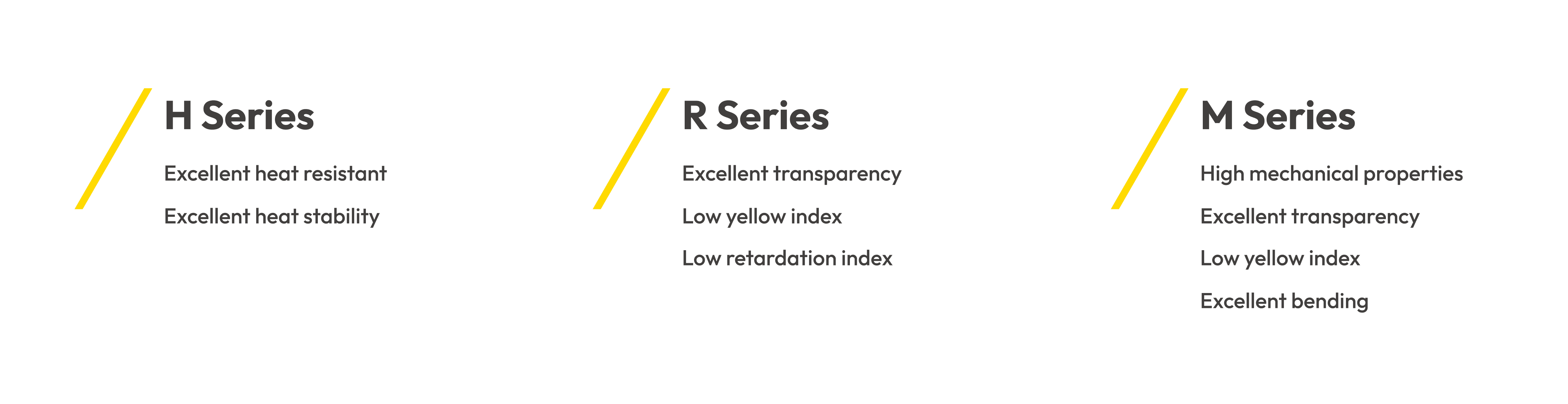 To meet diverse end-use requirements, LCY offers three CPI series—H, R, and M—each optimized for thermal resistance, optical stability, or mechanical flexibility, enabling precise, application-driven material selection. The H Series emphasizes high heat resistance and long-term stability for high-temperature or harsh environments. The R Series delivers low yellowing and low optical delay, making it ideal for premium optical and display applications. The M Series provides a balanced combination of transparency, mechanical strength, and flexibility.