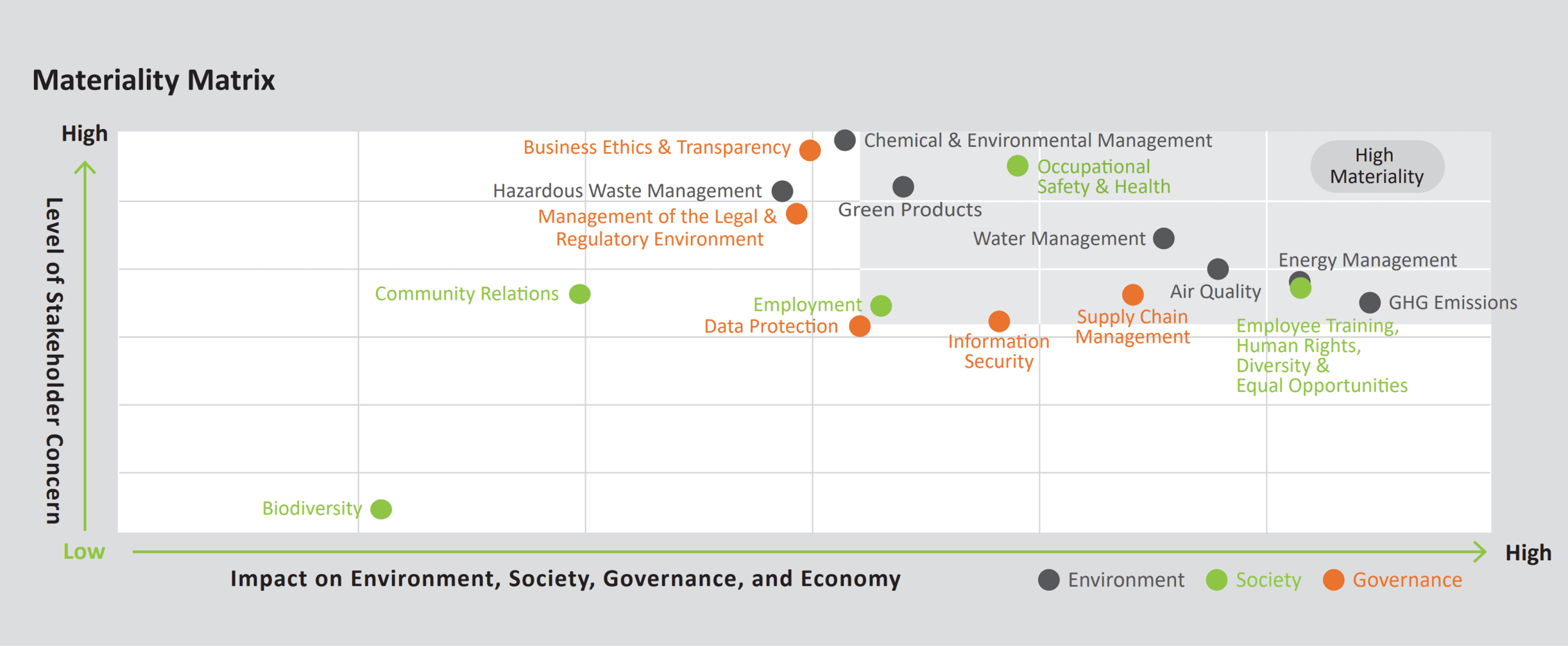 To identify a list of material topics relevant to LCY, we referred to the GRI Standards published by Global Reporting Initiatives (GRI) and the Sustainability Accounting Standards Board's (SASB) chemical sector guidelines for material topics relevant to the chemical industry. We also reviewed international sustainability ratings and industry benchmarks. LCY also regularly assesses material topics every two to three years and continues to respond to stakeholder feedback and recommendations through different communication channels.